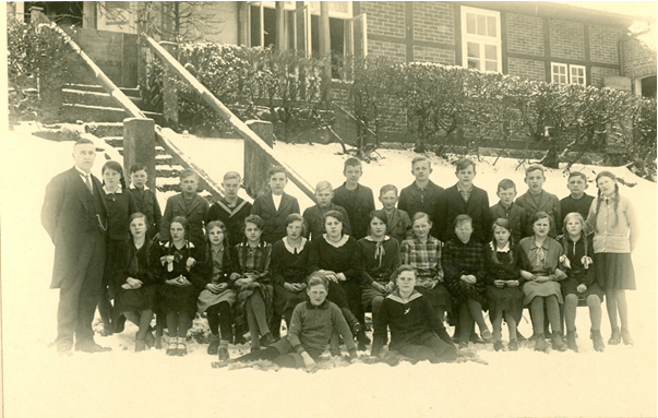 Personen: Hinten stehend von links: Pastor Herkens, Marie Kröger, Willi Vick, ? , Otto Kröger; sitzend: 4. Person von links: Olga Ehrhorn, 3. Person von rechts: Wilma Schierhorn;