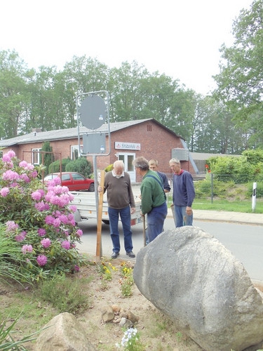 Aufstellen der Schilder; Personen: Gert Battermann, Dirk Lukaß, Benjamin Mencke, Jürgen Burfeind