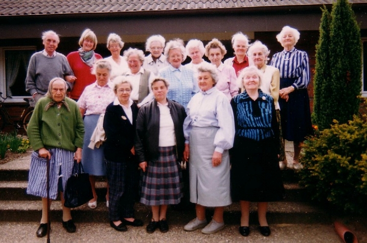obere Reihe von links: Emil Öhlers, Geli Battermann, Freundin von Frau Muus, Hedwig Zimmer, Hildegard Matthies, Elise Bahlhorn, Erika Kröger, ?, 2. Reihe: Hilda Mencke, Hertha Brüggemann, Frieda Muus, Elisabeth Lemke, vorn: Marie Börs, Irma Sergel, Ursula Möller, Elsa Lobschuß, Selma Marks.