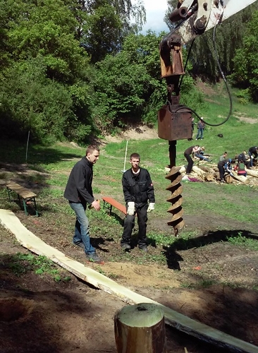 Für die Bänke der Tribüne werden Löcher gebohrt Personen: Benjamin Mencke, André Laboga